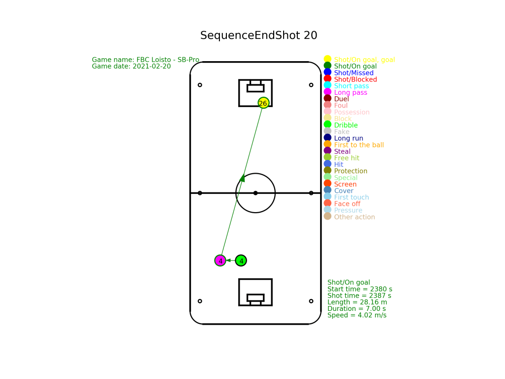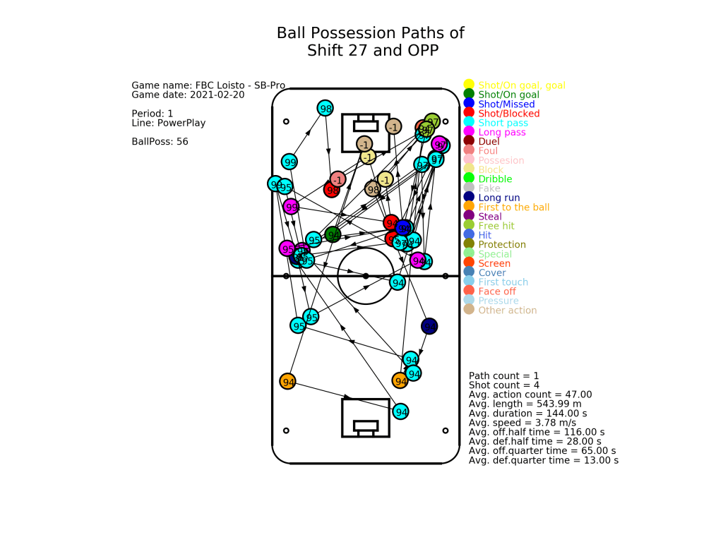 Entä sitten pelin kulku muuten? Ottelun ensimmäinen erä oli melko selvästikin pelillisesti Loiston, vaikka tulostaudulla oli sen jälkeen 1-1. Maaliodottama oli heille 2,50-1,25 ja BallPoss 57-43%, Loisto siis sekä tuhlaili maalipaikoissaan että Kataja SB-Pron maalilla teki muutaman huippupelastuksen. Pelin kokokuva oli melko levoton. Kumpikaan ei pelannut varman päälle, vaan Loisto haastoi joka kentän osa-alueella ja SB-Pro yritti liian suoraviivaisesti hakea nopeita vastaiskuja ja kääntöjä. MyCoazhin lopputuloksen ennustus (EstFT) oli ensimmäisen erän jälkeen 6-4. Ja vaikka ensimmäisestä erästä jäi mielikuva ”vauhdikkaasta” pelistä, totuus Loiston onnistuneen pallollisen pelin keskinopeudesta oli 3,3 m/s, joka on melko hidasta pelaamista, jos sitä verrataan vaikka SSLDamin peliin (keskinopeus 3,7 m/s) tai FLiigaN:n keskiarvoihin (3,5 m/s).