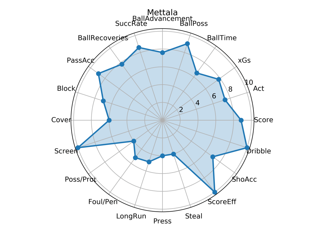 Iida Mettälä oli yleisön lisäksi myös MyCoazhin valinta ottelun MVP:ksi. Hän teki tehot 1+1 ja varsinkin maalin alustus ennen maalisyöttöä oli aika ”jäätävä”. Siinä vietiin vastustajan laitahyökkääjältä länget oman maalin edessä. Mettälällä oli pallollista peliaikaa kokonaisuudessaan 199 sekuntia eli yli 3 minuuttia, ja hän piti pallon omalla joukkueella 90-prosenttisesti. Hänen syöttöprosenttinsa omille oli 89 ja syöttöjä oli pelissä 46. Mettälän onnistuneiden tapahtumien pallonetenemä (BallAdvancement) oli noin 590 metriä ja onnistuneen pallollisen pelin keskimääräinen pelinopeus 3,3 m/s (BallPlaySpeed). Hän erottui näiden tilastojen lisäksi edukseen Loisto-puolustuksessa voittamalla 17 kertaa pallon omalle joukkueelleen ja menettämällä sen vain 9 kertaa. Muut kolme puolustajaa voittivat yhtä paljon kuin menettivät palloja.